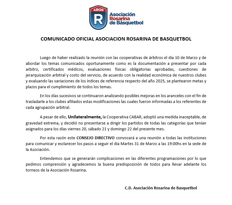 COMUNICADO OFICIAL ASOCIACION ROSARINA DE BASQUETBOL